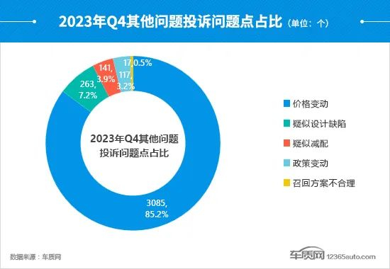 在本季度其他问题投诉问题点排名中,“价格变动”投诉问题点和占比双双出现大幅提升,其中占比再次超过总量的八成。此外,“政策变动”投诉问题点环比也出现明显增长,较三季度上涨77.3%,与部分自主品牌新能源车型有关。