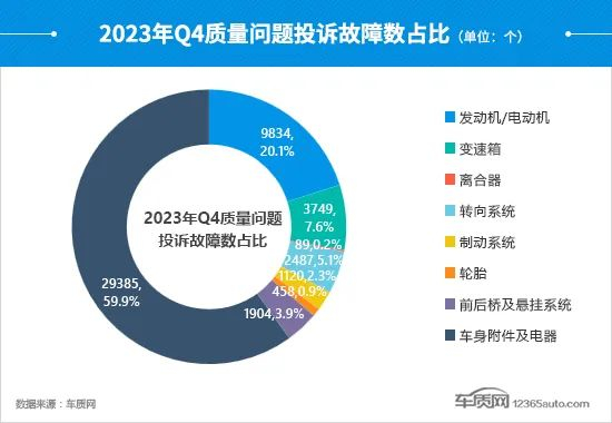在四季度质量问题投诉中,各系统的投诉故障数均较三季度有所下降,其中前后桥及悬挂系统降幅最大,环比下降28.5%。车身附件及电器的投诉故障数相比三季度微降3.1%,但投诉故障数占比却提高了8.5个百分点。