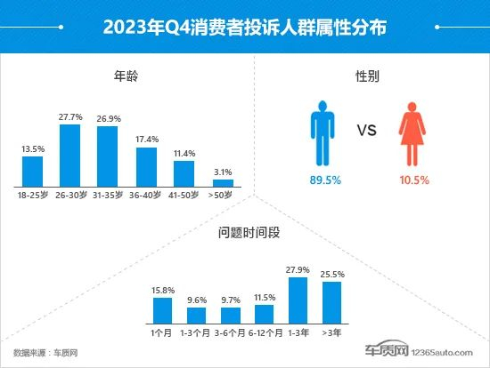 四季度投诉中,女性消费者占比略有回升,重新回到两位数,较三季度提高0.8个百分点。从各年龄段投诉占比情况来看, 26-30岁和31-35岁这两个年龄段的投诉占比之和超过了五成,依旧是投诉的主力人群,但占比与三季度相比略有下降。相比之下,36岁(含)以上年龄段的投诉占比之和超过三成,较三季度有所提升。从车辆出现问题的时间段来看,购车1-3个月和3年以上的投诉占比出现明显提升,特别是后者,较三季度提高了4.2个百分点,成为投诉占比最高的问题时间段。