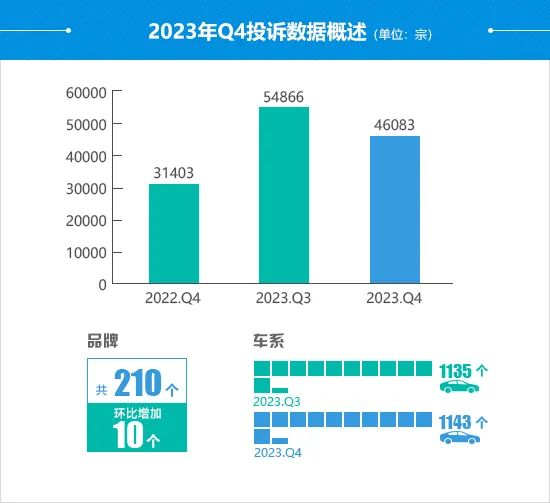据车质网数据显示,2023年四季度共受理消费者对汽车产品的有效投诉46,083宗(含第三方平台和后装轮胎投诉共36宗),环比下降16%,同比上涨46.7%。据统计,本季度受理投诉共涉及210个汽车品牌旗下的1,143个车系,环比增加10个品牌及8个车系。
