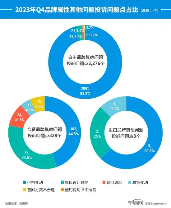 四季度,自主品牌其他问题投诉问题点均出现大幅提升,较三季度上涨54.1%。“价格变动”成为自主、合资和进口品牌占比最高的投诉问题点。值得注意的是,合资品牌“疑似设计缺陷”投诉问题点环比出现小幅增长,占比超过总量的三成,投诉增量来自于某德系品牌SUV车型。
