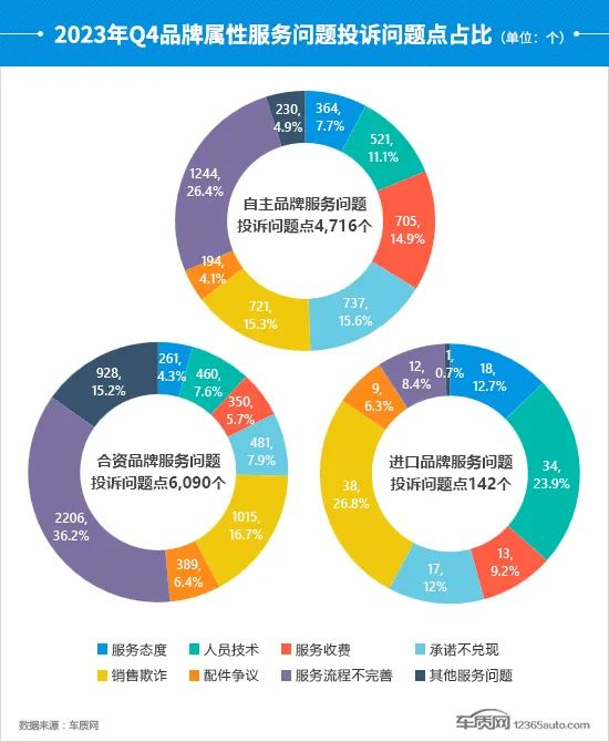 四季度,自主、合资品牌的服务问题投诉问题点环比出现回落,其中自主品牌降幅最大,较三季度下降33.2%。从占比情况来看,自主和合资品牌的服务问题集中在服务流程不完善,但投诉问题点和占比均较三季度有所降低。此外,承诺不兑现成为自主品牌占比第二高的服务问题,投诉问题点占比较三季度提高3.9个百分点。