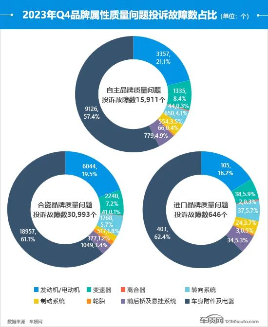 四季度,合资品牌的投诉故障数较三季度有所提升,环比上涨9.1%。而自主和进口品牌的投诉故障数环比均有所降低,其中后者降幅最大,达到了44.7%。从占比情况来看,自主品牌车身附件及电器的投诉故障数占比回升,取代发动机/电动机成为自主品牌投诉故障数占比最高的系统问题。反观合资和进口品牌,两者的发动机/电动机投诉故障数和占比都迎来提升,特别是合资品牌,其发动机/电动机投诉故障数环比出现翻倍增长。