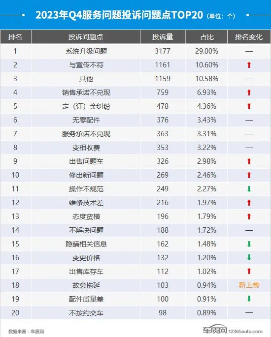 在四季度排名前20位的服务问题投诉问题点中,“系统升级问题”依旧排名首位,但投诉问题点环比出现明显下降。“定(订)金纠纷”本季度投诉问题点涨幅明显,较三季度上涨33.1%,排名也升至第五位,投诉增量来自于部分自主品牌新能源车型。