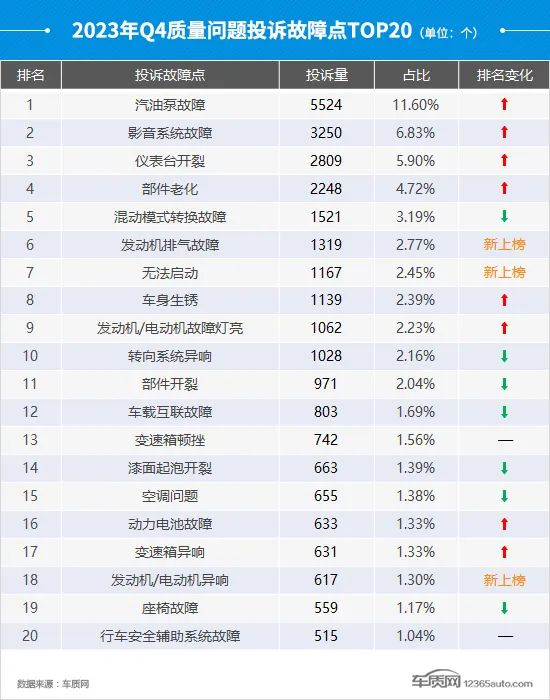 在本季度排名前20位的质量问题投诉故障点中,“汽油泵故障”排名跃升至首位,投诉故障数环比上涨21.9%,占比提升至两位数。与三季度相比,四季度新上榜的投诉故障点数量有所减少,其中“发动机排气故障”首次入榜便排名前列,投诉故障数超千个,与部分丰田品牌车型投诉量持续高企有关。