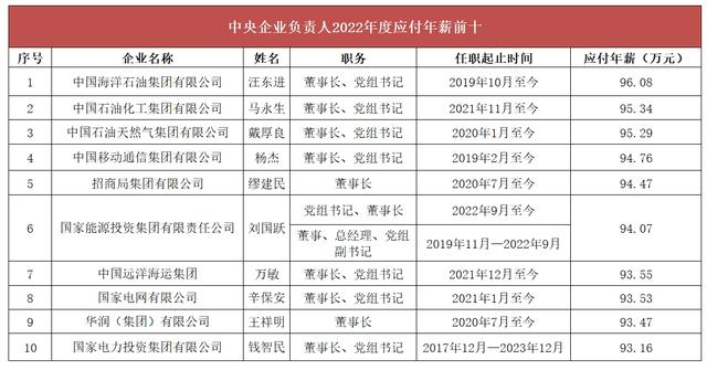 96家央企一把手年薪披露!三桶油董事长年薪居前三,中海油最高达96.08万元