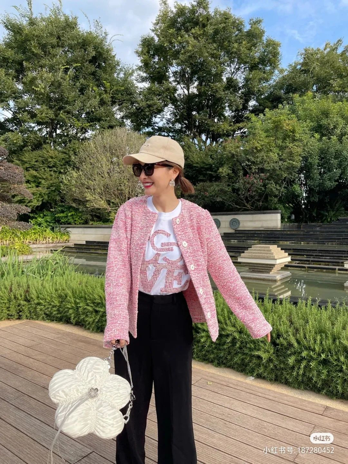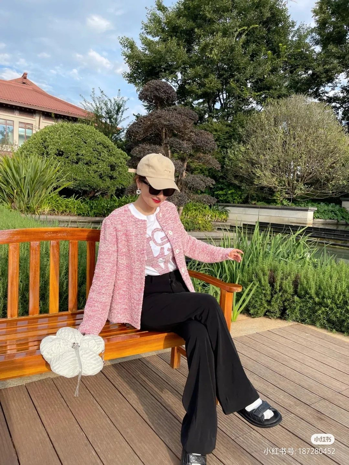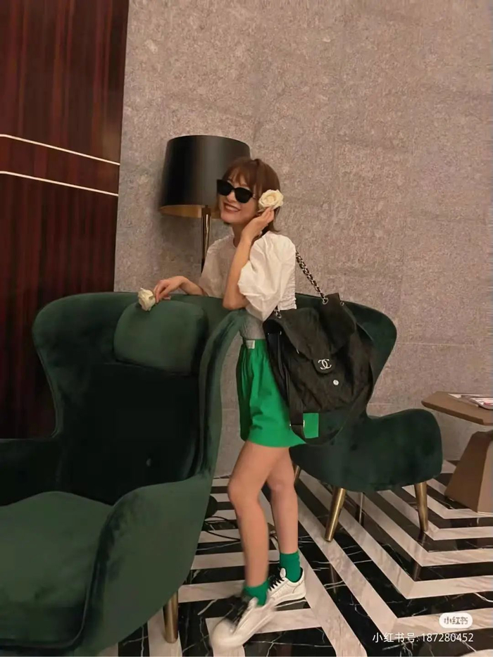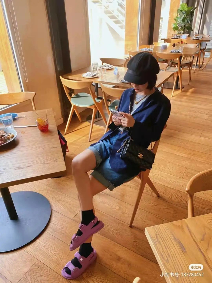 21年秋冬刚上市的CHANEL CF双金球款,吴昕立马背上身,经典的22尺寸,搭配CHANEL紫色老爹凉鞋,怪诞少女味儿就有了。