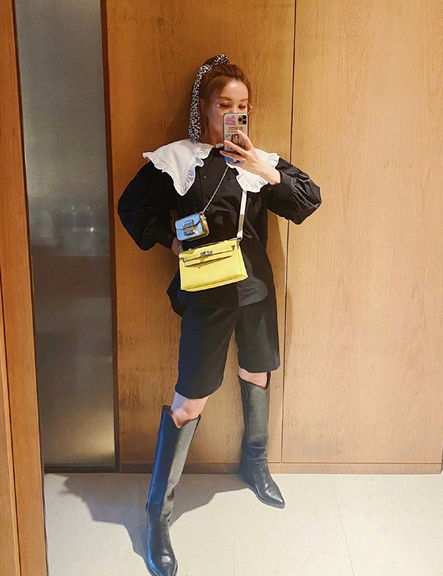 不只是颜色简单的黑白棕经典色系,明黄色的Kelly mini她也有晒出,
