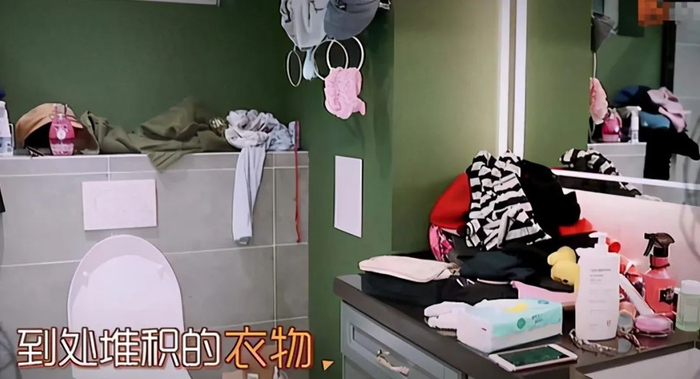卫生间也是大面积的浅绿色、墨绿色、白色交替的装潢风格,床和地板都是墨绿色的,但是这凌乱的画风也说明了吴昕是个不折不扣的宅女。