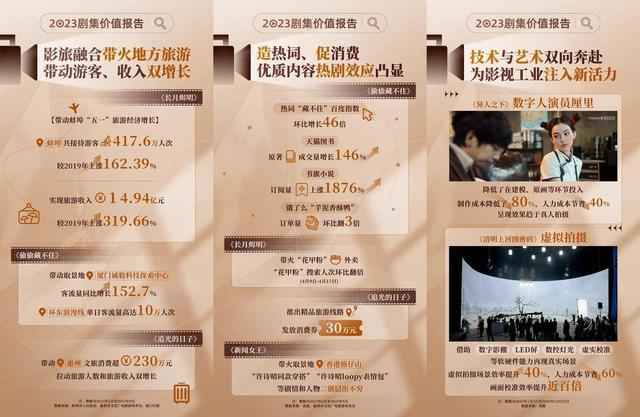 值得关注的是,影视剧还通过文旅融合,展现文艺作品正能量。多部剧集在“捧红”取景地的同时,也为城市旅游发展注入强劲动力。《报告》显示,《追光的日子》带动惠州文旅消费超230万元,拉动游客和旅游收入双增长;《长月烬明》带动蚌埠“五一”旅游收入14.94亿元,较2019年上涨319.66%。伴随着热剧播出,造热词、促消费等优质内容热剧效应凸显。如《新闻女王》带火取景地香港格仔山;《偷偷藏不住》带动书旗小说订阅量上涨1876%;惠州还在《追光的日子》热播期推出了4条精品旅游线路。