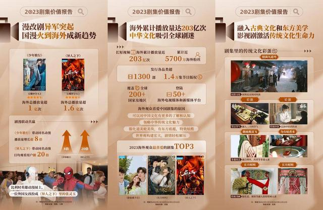 事实上,近年来,众多国剧也扬帆出海,在国际影视舞台上绽放光彩。《报告》显示,优酷发行各品类内容超1300部、1.4万集节目版权,海外累计播放量近203亿次,收获近5700万海外粉丝。了解中国文化、领略中华传统文化魅力;服化道美轮美奂、特效酷炫;剧情轻松解压、世界观构建宏大等是海外观众喜爱中国影视剧的原因。《偷偷藏不住》《长月烬明》《异人之下》收获高口碑,成2023海外观众最喜爱的国剧。