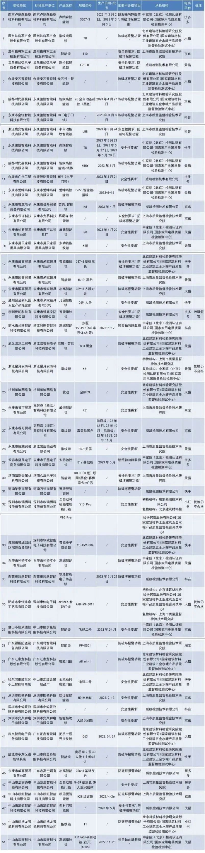 51批次电子门锁不合格样品具体为