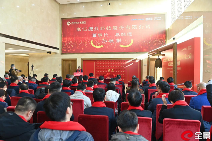 上市仪式现场,浙江捷众科技股份有限公司董事长兼总经理孙秋根在致辞中表示,今天,捷众科技成功登陆北交所,这是公司发展历程中的一个重要里程碑,也是一个崭新的起点。公司募投项目将紧紧围绕公司主营业务开展,以创新为抓手,进一步夯实公司的核心竞争力。