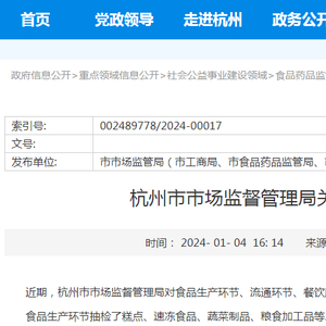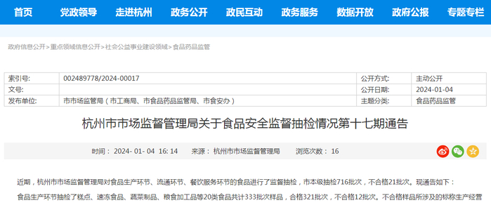 杭州市市场监督管理局关于食品安全监督抽检情况第十七期通告
