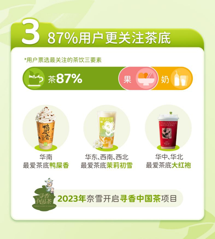 客群在成长,用户的关注点也在变化。报告中,用户票选出最关注的茶饮三要素依次为茶、果、奶,其中,87%用户表示更关注茶饮中的茶底。且用户对茶底的偏好呈现出较明显的区域差异,华南最爱潮汕名种凤凰单丛“鸭屎香”,华东、西南、西北最爱金奖茶“茉莉初雪”,华中、华北最爱非遗大师监制的岩骨乌龙“大红袍”。早在2023年3月,奈雪创始人彭心曾在CCFA中国连锁餐饮峰会上表示“2023年,传统茶将迎来年轻消费者的春天,茶饮需要回归茶本质”。同一时间,奈雪开启“寻香中国茶”项目,系统性梳理多年积累的好茶资产,这一举措在行业中颇具前瞻性。