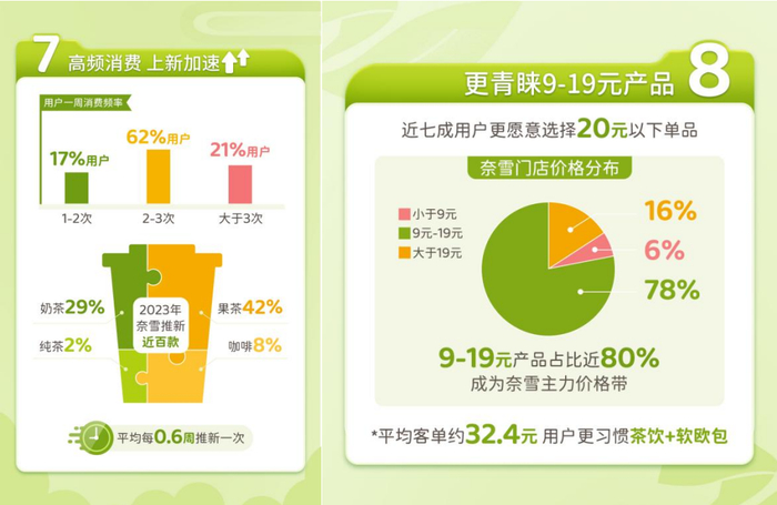 伴随着高频消费,用户也越来越倾向高质价比、更划算的产品,近七成消费者更愿意选择20元以下单品。奈雪也在不断调整优化价格策略,目前9-19元的产品占比近80%,已成为门店产品的主流价格区间。奈雪的茶2023年平均客单约为32.4元,这意味着用户在奈雪更习惯“茶饮+软欧包”,双品类模式将客单稳定在较高水平。