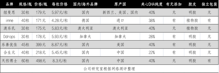 除去藻油供应商及产地影响,各品牌产品方面的差别还在于DHA纯度、有无添加、胶皮成分、是否有鱼腥味、是否有独立包装等方面。