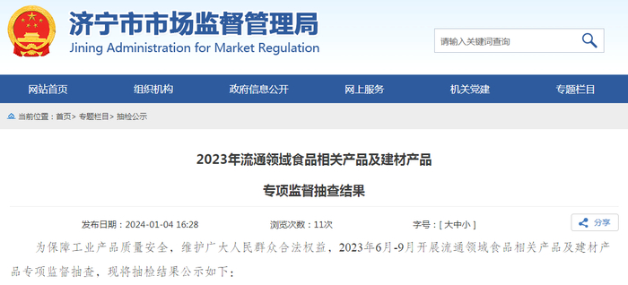 2023年山东省济宁市流通领域食品相关产品及建材产品专项监督抽查结果