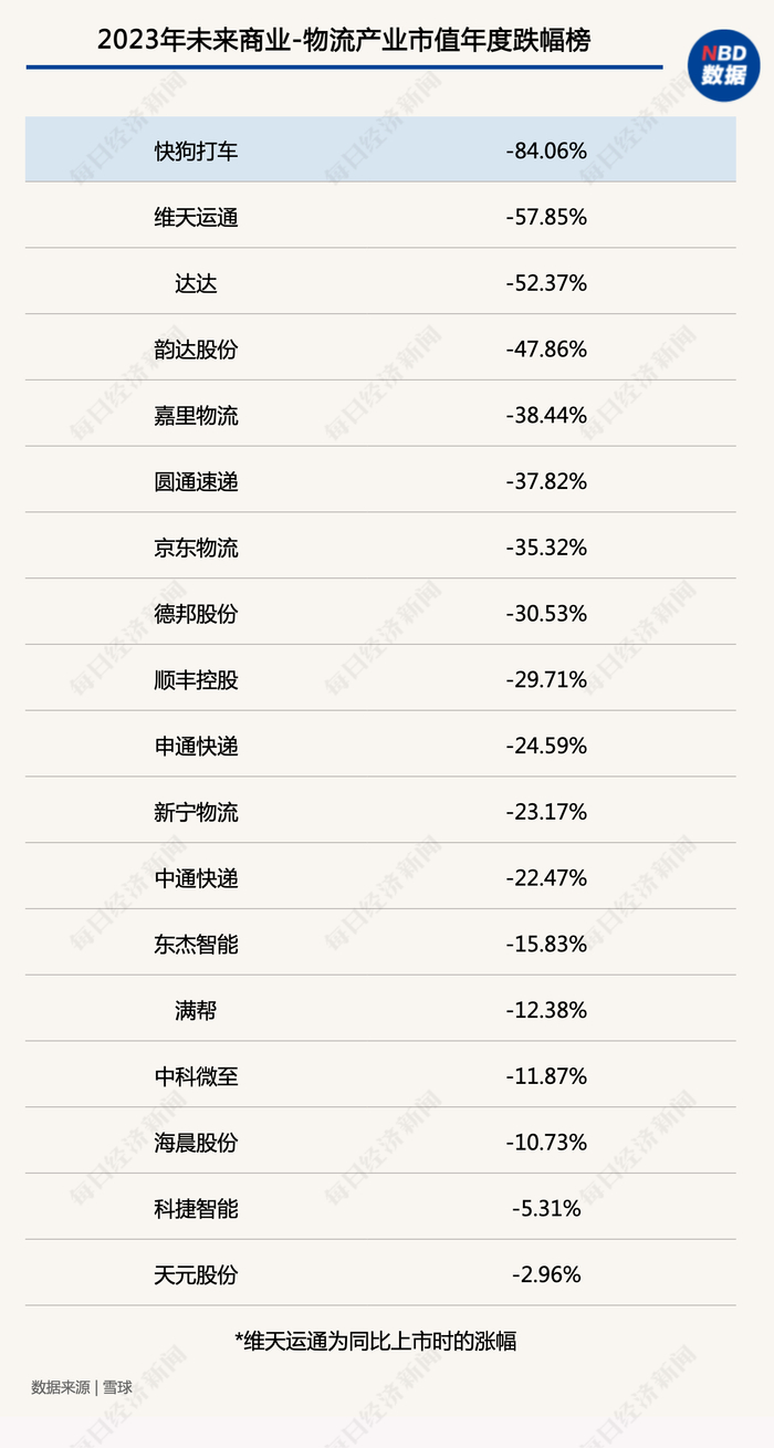 未来商业—物流产业市值榜数据显示,剔除三家今年上市的物流公司,2023年,物流公司跌幅最大的公司为快狗打车,市值年跌幅84.06%。