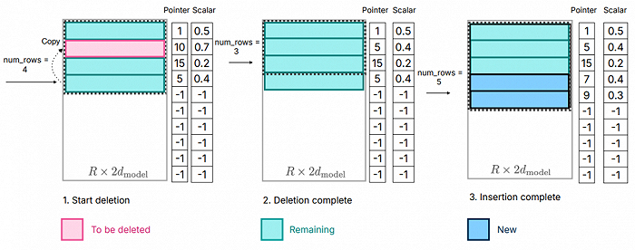 假设大模型正在处理Once upon a time there was a kid who had a dream这句话,在处理“Once upon a time there”这段字符的时候,图中上半部分的青色格子(神经元)处于激活状态;而当处理字段变到“upon a time there was”(往后推进了一个字符),图中下半部新启用了蓝色格子,并删除了了此前青色部分的几个格子(以粉色标注),其余青色保持不变。