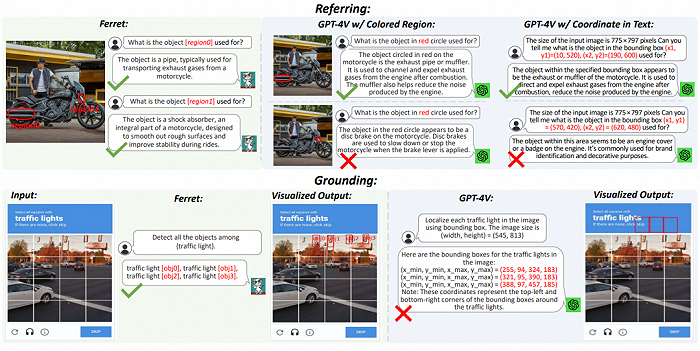 和GPT4相比,Ferret的领先之处在于,它不仅能准确识别并处理图像内容,还能用算法区分图片中各种元素(人、物体等等),并根据用户指令找出对应元素。