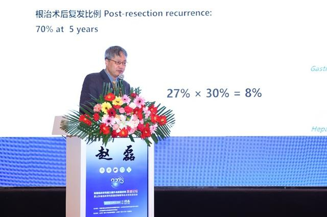 山东第一医科大学附属肿瘤医院院长助理赵磊作《PD-1联合SBRT新辅助治疗早期可切除肝细胞癌-Ib期Notable-HCC临床试验初步结果报告》主题报告,结合具体的临床研究项目,详细介绍了从临床问题的发现,研究的设计到成果整理的全过程。