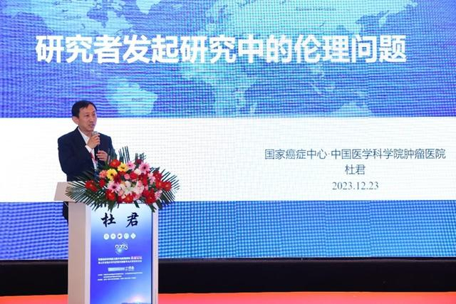 中国医学科学院肿瘤医院研究员杜君作《研究者发起研究中的伦理问题》主题报告,对研究者发起的临床研究过程中伦理审查流程、知情同意、风险控制等要点进行讲解。