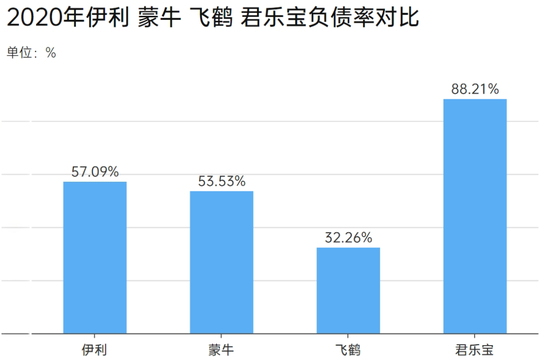 即便放在负债率普遍较高的乳企里,君乐宝也超出了同行一大截。同年横向对比,伊利为57.09%;蒙牛为53.53%;飞鹤为32.26%。2021年乳企的平均资产负债率为45.81%。