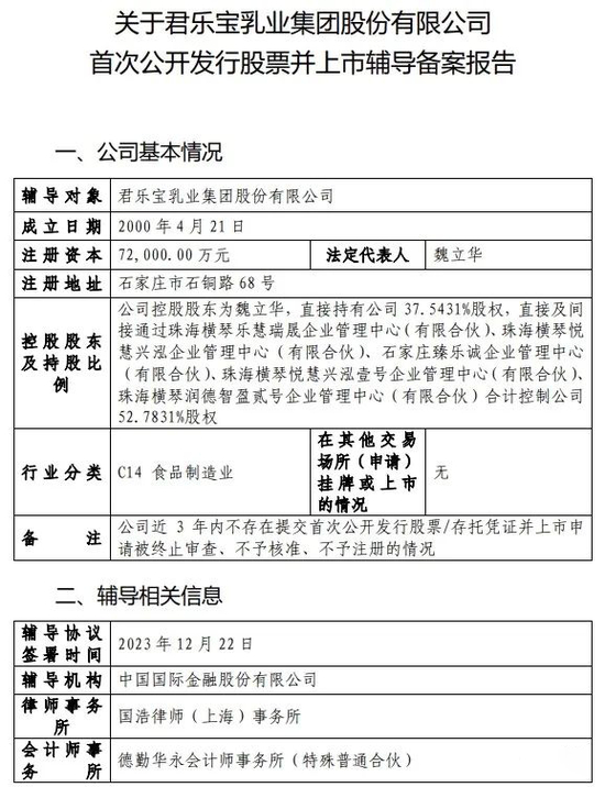 近日,河北证监局网站公布的一份报告显示,中金公司与君乐宝乳业集团已于2023年12月22日正式签署了上市辅导协议。