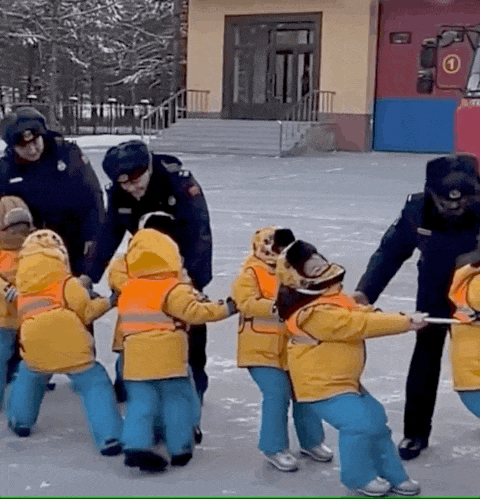 在和“小砂糖橘”的拔河比赛中,消防员连“假摔”技术都用上了。
