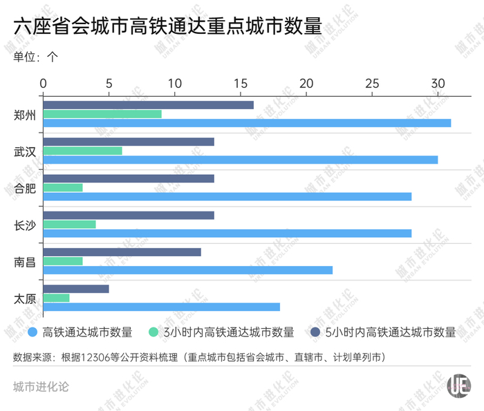 城叔梳理了中部6个省会城市与全国36个重点城市(包括直辖市、省会城市、计划单列市)间的高铁通达度,以及3小时、5小时内可通达的重点城市数量。