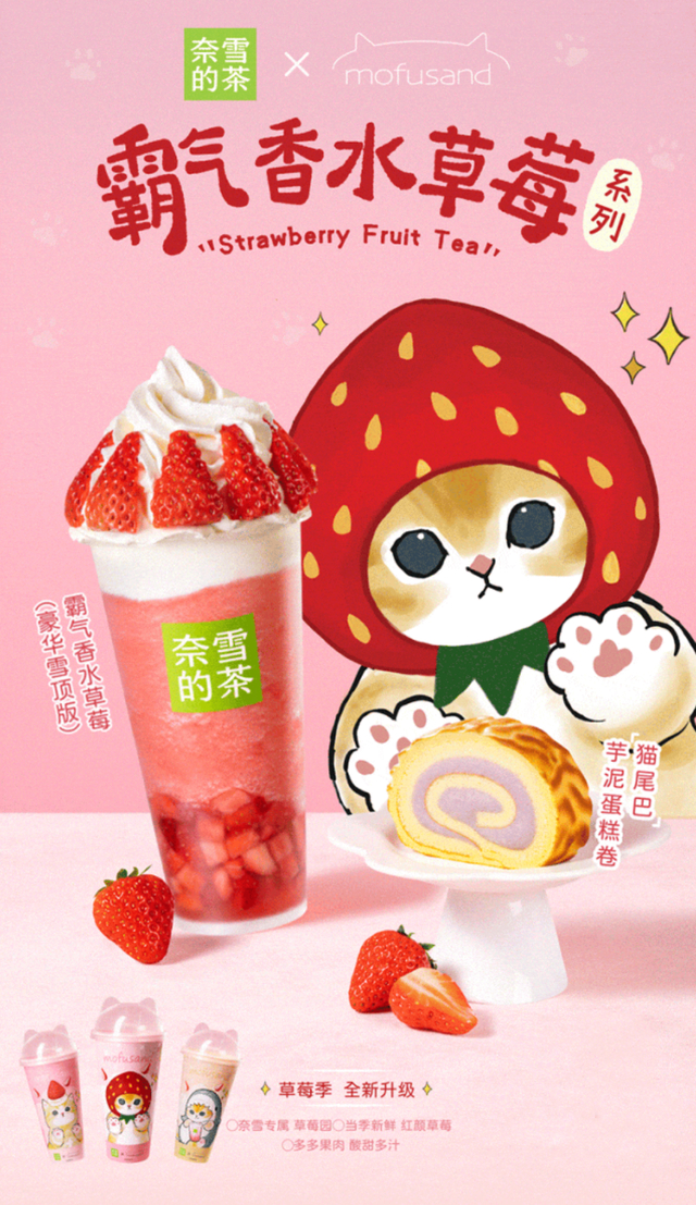 1月3日,奈雪 X mofusand 全国上新,#奈雪草莓季#全新升级,当季新鲜的红颜草莓唱主角。