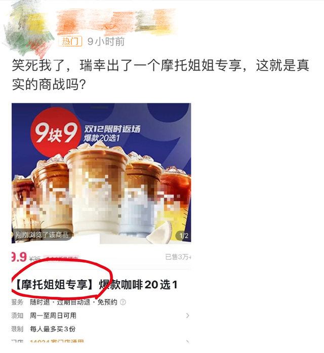 紧接着,多位网友于下午爆料,瑞幸咖啡在直播间的一款团购产品出现了“摩托姐姐专享”的前缀。由于“摩托姐姐”是王一博粉丝的昵称,导致有粉丝误以为自家明星代言了该品牌而下单购买了团购产品,从而引发热议。#瑞幸 摩托姐姐专享#这一话题也一度冲上热搜第一位。