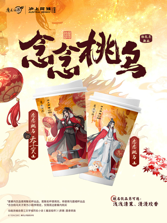 1月4日,沪上阿姨 X《魔道祖师》动画的联名活动正式开启。此次联名推出的轻乳茶新品,有“念念桃乌”“浅浅清茉”“漫漫玫香”三款。
