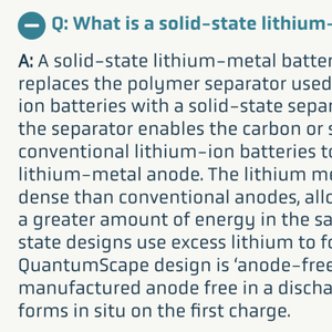 大众集团电池子公司PowerCo披露,PowerCo通过亲手实验证实,QS的无负极(anodeless)固态电池样本,能够做到充放电1000次,且在测试完成时电池“几乎没有老化”,仍保持95%的容量(或者说放电能量保持率)。大众集团是QS的主要投资者之一。