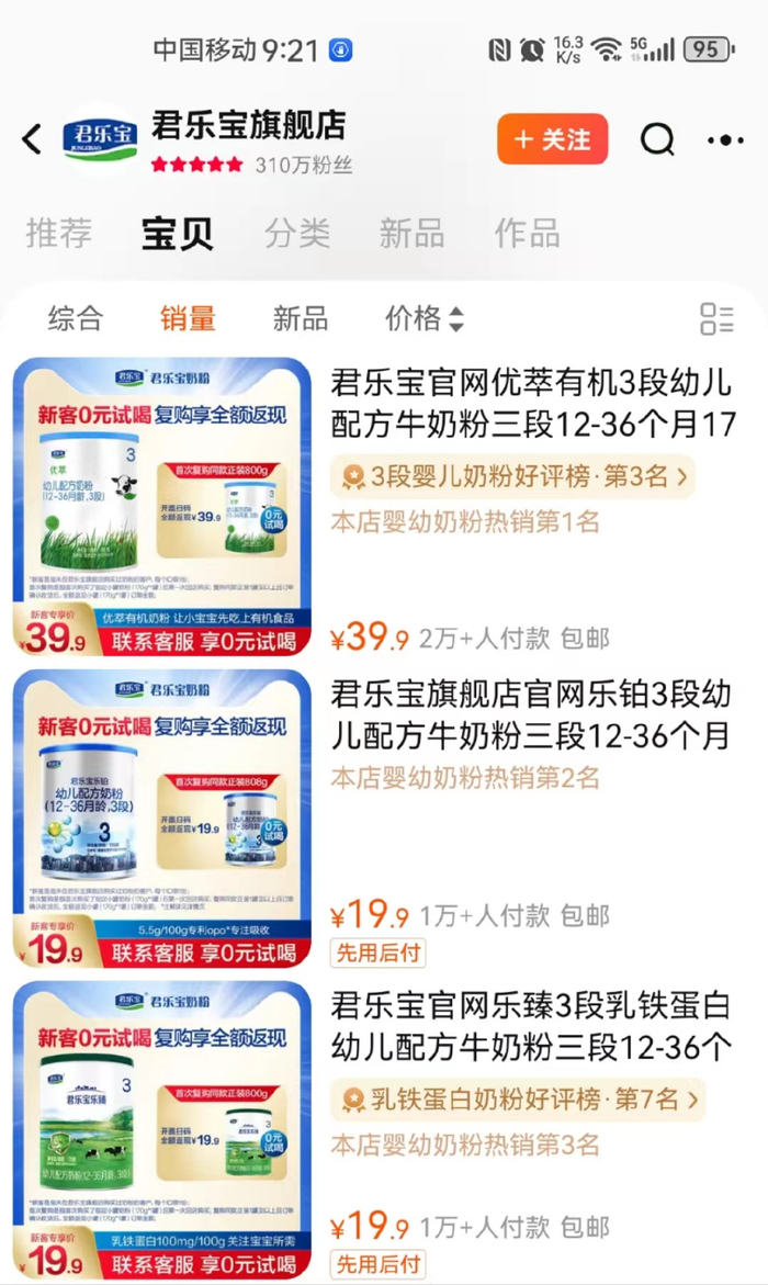 据君乐宝天猫官方旗舰店显示,销量排名靠前的产品主要以50元以下的小罐奶粉为主,平均单价较低。