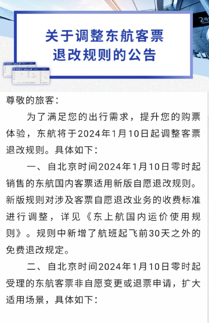 2、东航航班起飞前30天之前将免费退改 中国东方航空5日发布公告,自10日零时起销售的东航国内客票适用新版自愿退改规则,规则中新增了航班起飞前30天之外的免费退改规定。(中国东方航空微信公众号)