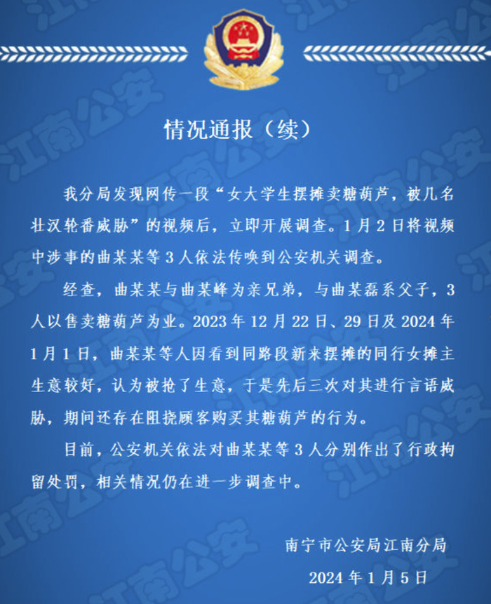 3、警方再通报女大学生摆摊被威胁 5日,广西南宁市公安局江南分局通报,经查,曲某某与曲某峰为亲兄弟,与曲某磊系父子,3人以售卖糖葫芦为业。2023年12月22日、29 日及2024年1月1日,曲某某等人因看到同路段新来摆摊的同行女摊主生意较好,认为被抢了生意,于是先后三次对其进行言语威胁,期间还存在阻挠顾客购买其糖葫芦的行为。目前,3人已被行政拘留。(@南宁江南警方)