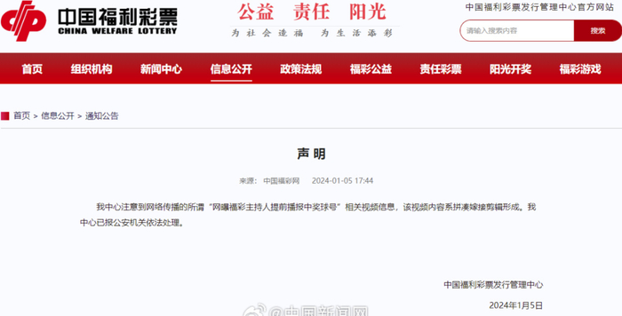 1、提前播报中奖球号?中国福彩回应中国福利彩票发行管理中心5日发布声明:我中心注意到网络传播的所谓“网曝福彩主持人提前播报中奖球号”相关视频信息,该视频内容系拼凑嫁接剪辑形成。我中心已报公安机关依法处理。(中国福利彩票网站)