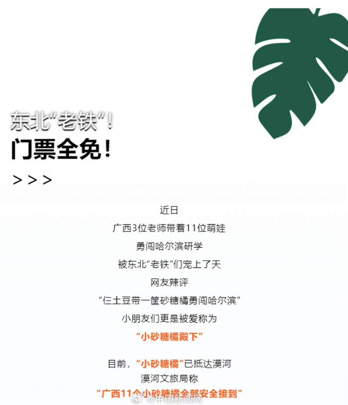 3、广西砂糖橘回礼东北老铁 最近,广西3位老师带着11个“砂糖橘”赴东北研学被宠上天,现在广西的“回礼”来了。从1月8日—2月8日,崇左市所有A级旅游景区(45家)免费向东北“老铁”们开放,只需凭借东北三省(黑、吉、辽)身份证就可享受首道门票免费。(崇左市文化和旅游局微信公众号)