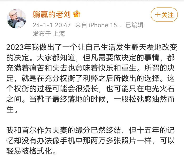 最后的几句话我想对首尔说——很抱歉,直到现在我才站出来做这些回应。之前我害怕引起争端,害怕把自己也卷进舆论的漩涡之中,所以选择了沉默。但是现在,新一年开始了,生活也在我面前慢慢展开了全新的画卷,所以我也要开始勇敢一点,直面内心的怯懦,做一个有担当的人了。你是我这辈子遇见的最善良的人。不管我曾经多么颓废,你始终没有松开拉着我的手。你明知彼此无法更爱对方,也始终没有主动离开。很多人都说我在成全你,但只有我一个人清楚,是你在成全我。你在婚礼上的承诺已经全部兑现。而我却有太多的承诺沦为空谈。你对我问心无愧,我对你却难言心安理得。跟你在一起的这十五年,是我人生中最安稳的十五年,感谢一直以来你对我的保护。新的一年开始了,我也应该重新找回自己,告别躺赢的人生了。虽然爱人的缘分尽了,我们依然是亲人和最好的朋友,依然是多乐的爸爸妈妈,依然是彼此最可仰仗的后盾。祝福你在新的一年里被爱意包裹,也坚信你所有的梦想都可以一一实现!