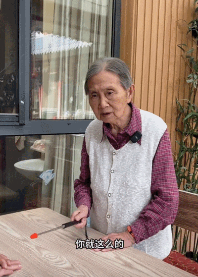 看到白发苍苍的奶奶拿着小教鞭说出上面这段话,还以为这是个正在教育年轻人“吃亏是福”的老人。