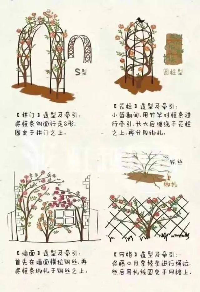 1、藤本月季的横向牵引很是关键,不同的牵引方式将影响来年的开花效果。对于网格,栅栏一类种植的藤本月季要注意尽可能的将枝条拉平,将其小心系牢,来年开花效果会很壮观。对于拱门或柱状的藤本月季也要通过来回缠绕(即走S路线或环线的方式)达到变相横牵的目的。