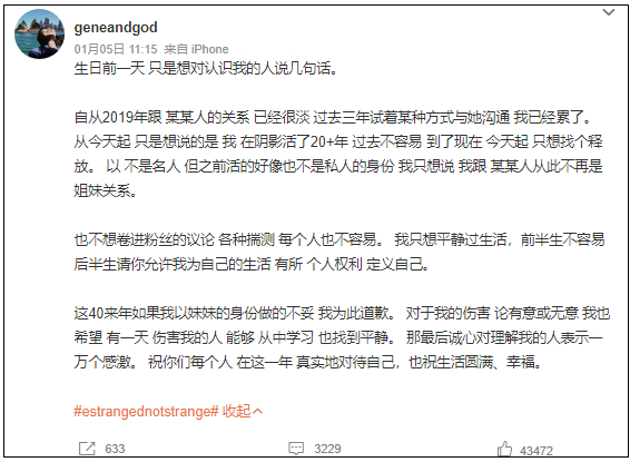 1月5日,新加坡歌手孙燕姿的妹妹孙燕美(@geneandgod )在自己生日前一天发文,宣布“从此不再是姐妹关系”,虽然没有点名,但暗指与孙燕姿断绝姐妹关系。此文引发热议,“孙燕姿妹妹发文断绝关系”词条也于当天晚间8时36分登上微博热搜榜冠军。
