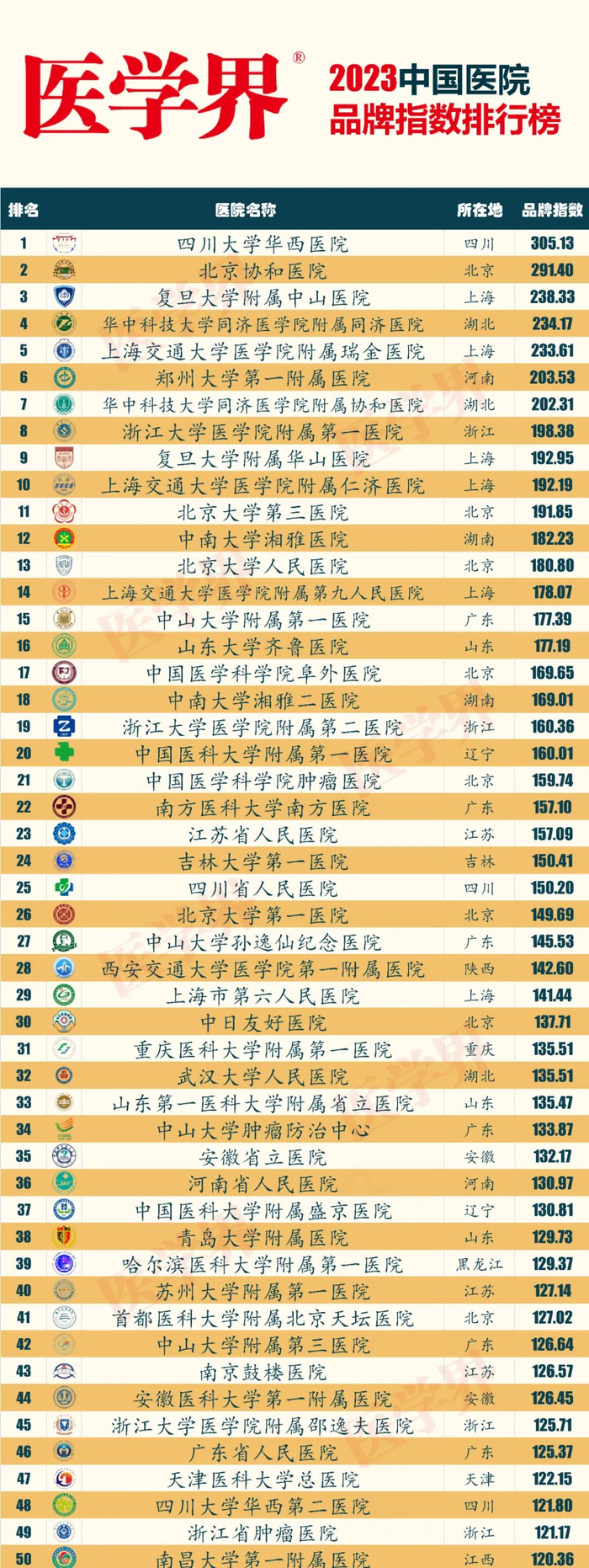今天,由“医学界”主持的2023中国医院品牌指数排行榜重磅发布。四川大学华西医院、北京协和医院、复旦大学附属中山医院分列前三。