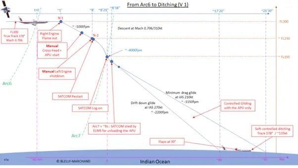 马尔尚和布莱利的新研究,利用第六弧线和第七弧线计算出MH370最后阶段的飞行剖面图。通过假设最好和最坏的情况,可以找到飞机在通过第七弧线后的最远和最近飞行距离。