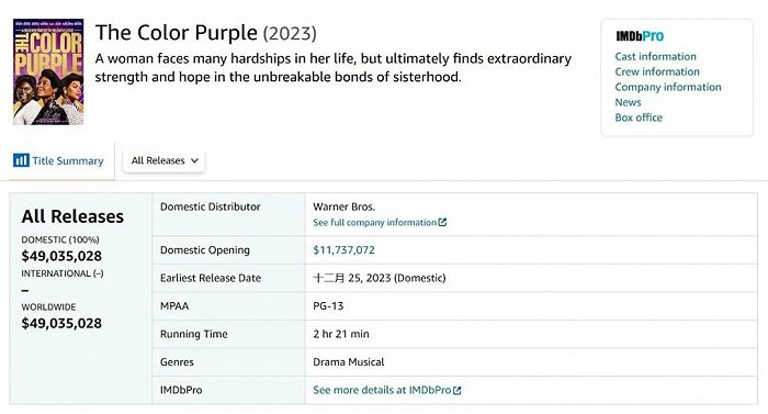 除北美之外,《紫色》尚未展开国际市场的扩映之旅。根据IMDb网站的信息,《紫色》接下来还将进军喀麦隆、巴西、丹麦、澳大利亚、日本和乌克兰等,但海外院线的票房潜力恐怕有限。