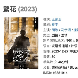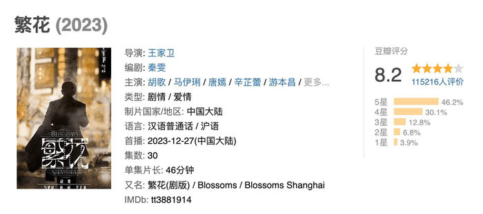 1月6日,由王家卫执导,秦雯编剧,胡歌、马伊琍、唐嫣、辛芷蕾等主演的电视剧《繁花》豆瓣评分从8.1开分涨至8.2,11.5万余人打分,其中五星占46.2%。在腾讯视频平台上,《繁花》普通话版和沪语版合计弹幕互动量破1000万,连续5日单日弹幕互动量破100万。