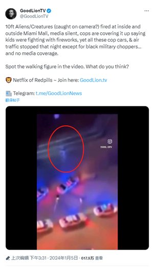 报道提到,一个推广涵盖科幻、阴谋论等内容电影和纪录片的X平台账号晒出现场视频称,“10英尺高的外星人/生物(被摄像机拍到?)朝迈阿密购物中心内外开火,媒体沉默,警察掩盖说孩子们燃放烟花并打斗,然而除了黑色军用直升机,所有警车和空中交通都在那天晚上一动不动……这却没有媒体报道。视频中出现了行走的身影。你觉得呢?”↓