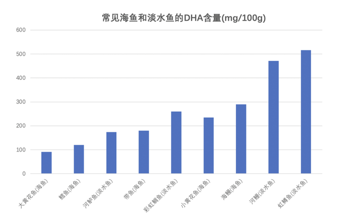 白腹鲭和花腹鲭的 DHA 分别是 660毫克/100 克[1]、755毫克/100 克[2],虽然比大西洋鲭鱼低,但是却比下图中的这 9 种鱼的高。